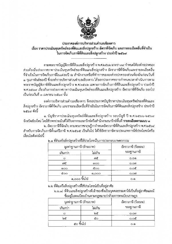 ทางองค์การบริหารส่วนตำบลเชียงดาว ขอแจ้งประชาสัมพันธ์ให้ประชาชนทราบถึงการประกาศราคาประเมินทุนทรัพย์ของที่ดินและสิ่งปลูกสร้าง (ภ.ด.ส.๑) อัตราภาษีที่จัดเก็บ และรายละเอียดอื่นที่จำเป็น ในการจัดเก็บภาษีภาษีที่ดินและสิ่งปลูกสร้าง ประจำปี พ.ศ. ๒๕๖๙