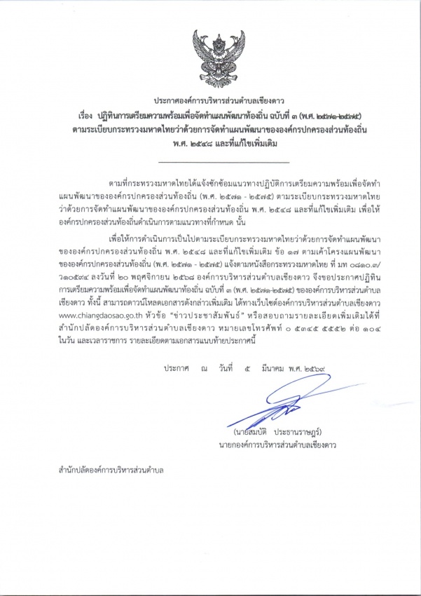 ประกาศองค์การบริหารส่วนตำบลเชียงดาว เรื่อง ปฏิทินการเตรียมความพร้อมเพื่อจัดทำแผนพัฒนาท้องถิ่นฉบับที่ 1 (พ.ศ. 2571 -2575)