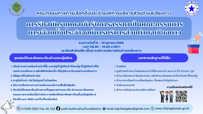 1 | ประชาสัมพันธ์ การรับสมัครบุคคลเข้ารับการสรรหาเป็นคณะกรรมการการเลือกตั้ง ประจำองค์การบริหารส่วนตำบลเชียงดาว | 222 KB. | 6 |