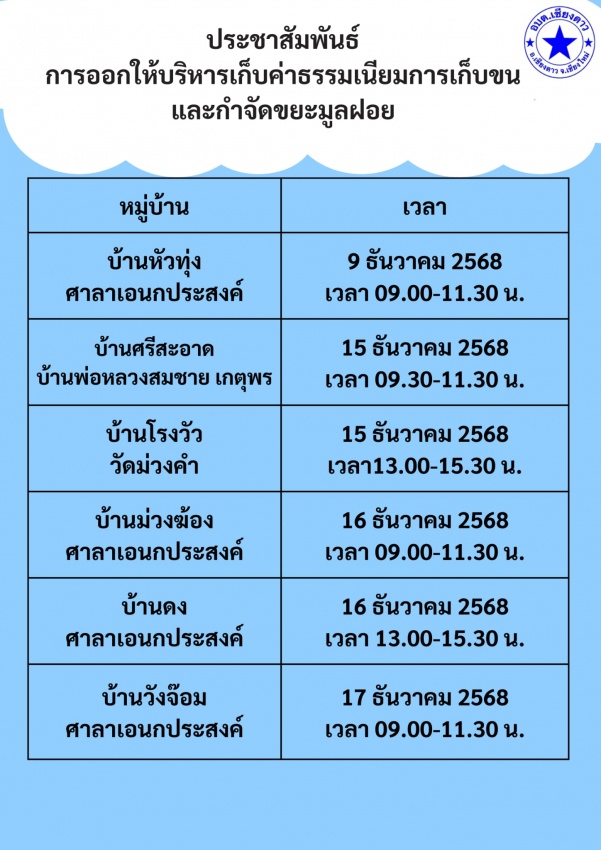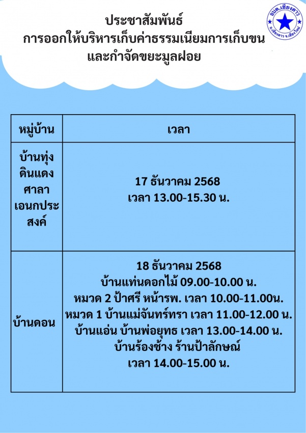 ประชาสัมพันธ์ การออกให้บริการค่าธรรมเนียมการเก็บขน และกำจัดขยะมุลฝอย ประจำเดือนธันวาคม 2568