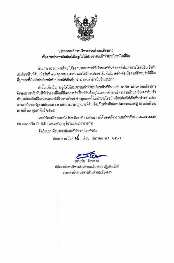 ประกาศองค์การบริหารส่วนตำบลเชียงดาว เรื่องขอประชาสัมพันธ์เพื่อจูงใจให้ประชาชนเข้าทำประโยชน์ในที่ดิน