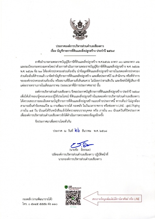 ประกาศองค์การบริหารส่วนตำบลเชียงดาว เรื่อง บัญชีรายการที่ดินและสิ่งปลูกสร้าง ประจำปี 2569
